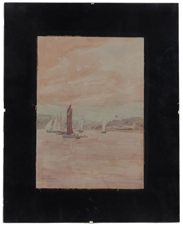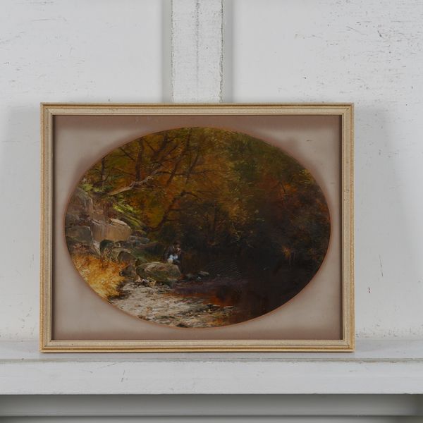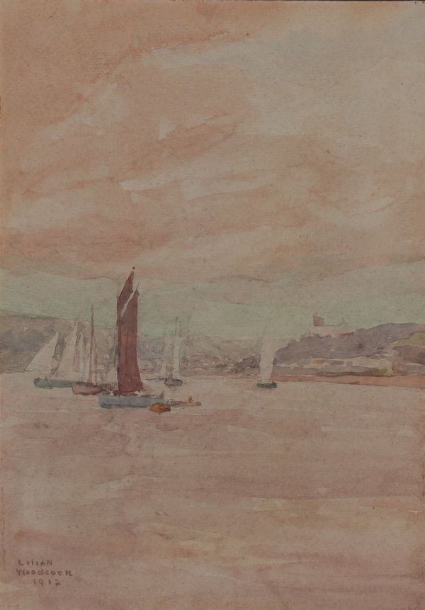 Fishing a shady pool oil on canvas 28 x 36.5cm, oval together with Sailing boats off the coast by Lilian Woodcock, signed and dated, '1912', watercolour, 24 x 17cm, (unframed) (2)