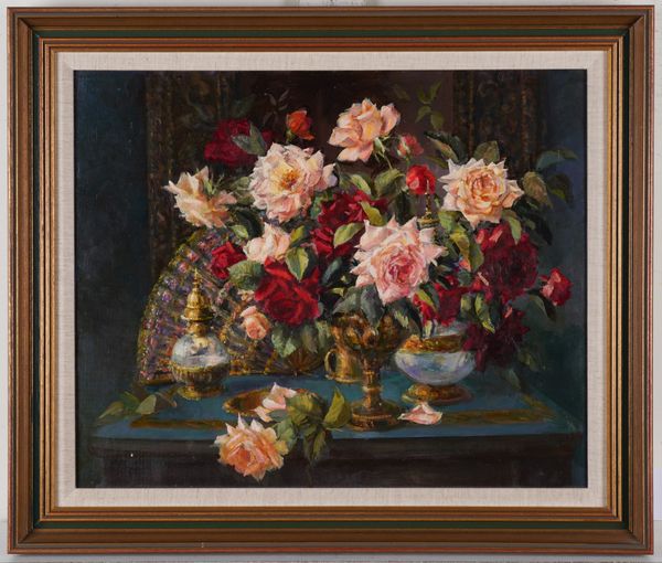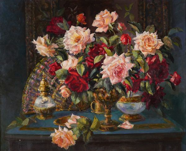 Still life of roses with a fan with artist's label (to backboard) oil on canvas-board 45 x 55cm ARR
