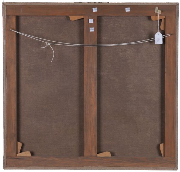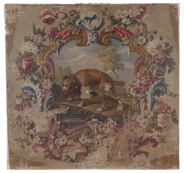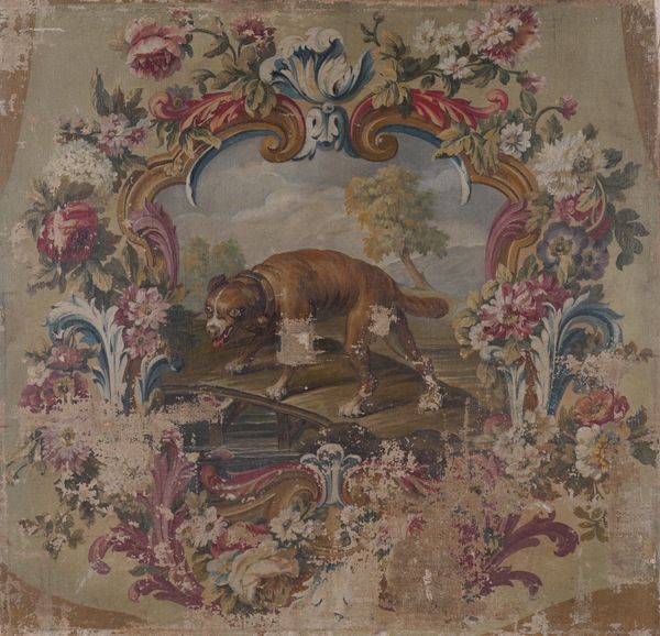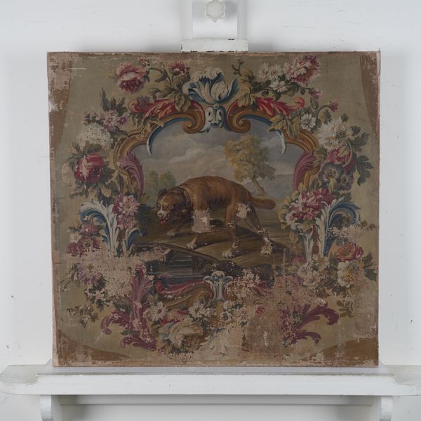 A dog on a bridge within a floral cartouche oil on canvas 71.5 x 75cm (unframed) Provenance Private collection, UK