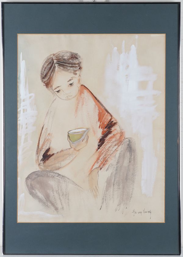 Child holding a bowl signed 'Ha Van Vuong' (lower right) watercolour and gouache 60 x 47cm together with a watercolour and gouache by the same hand, Longans, signed, 60 x 47cm (2) ARR