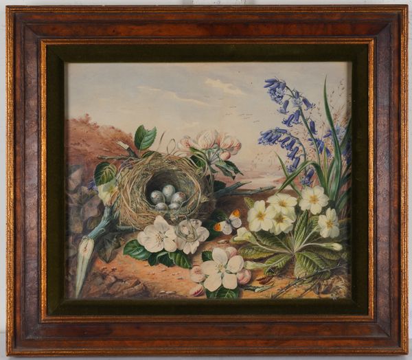Still life of bird’s eggs in a nest signed 'Mrs Withers Del' (lower left) watercolour 31.5 x 38cm