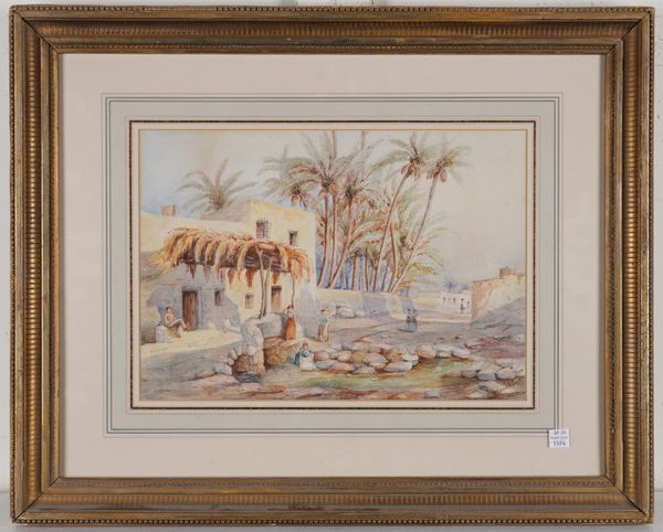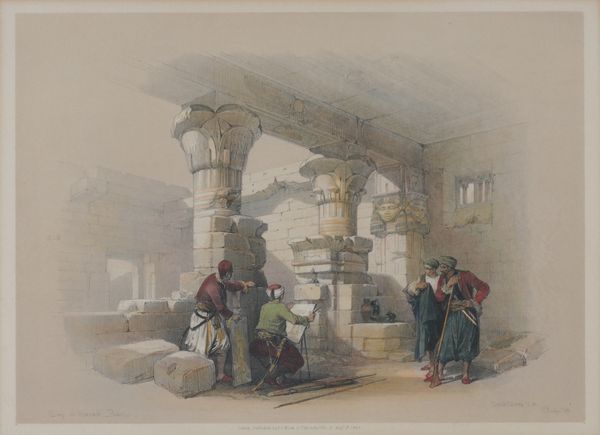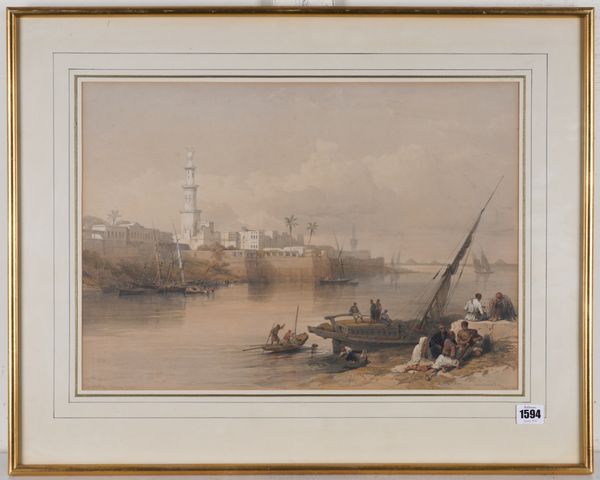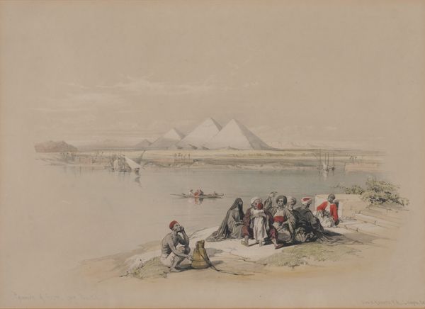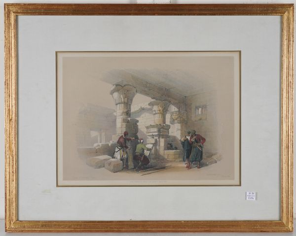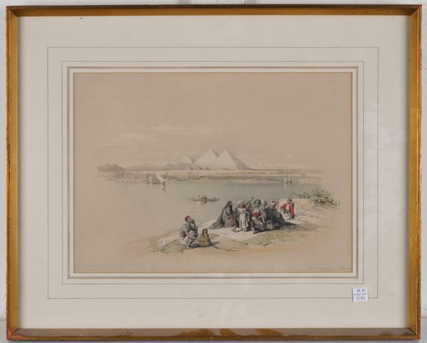 together with two other lithographs by Louis Haghe after David Roberts, Pyramids of Gezeeh, from the Nile, 24.5 x 34.5cm; Dayr el Medeeneh, Thebes, 25 x 35cm; and a watercolour of figures by palm trees, signed 'E Monckton', 24 x 35cm