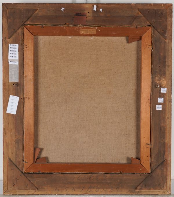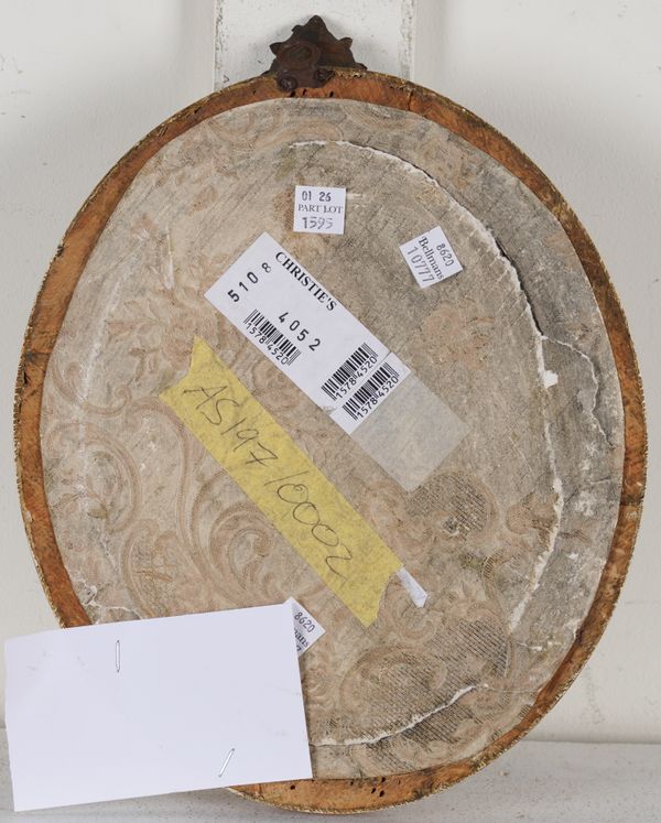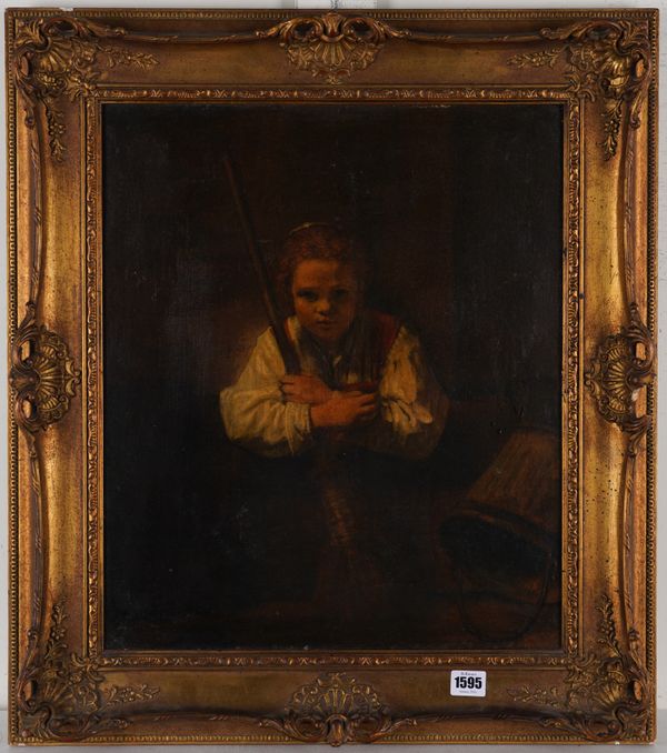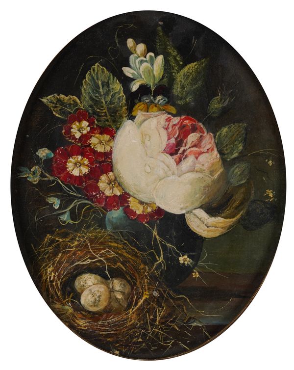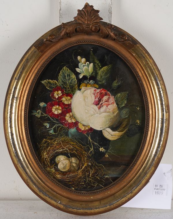 A girl with a broom oil over a printed base on canvas 49.5 x 43cm together with Dutch School, Still with flowers and bird's nest, oil on board, oval (2)