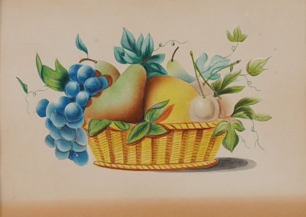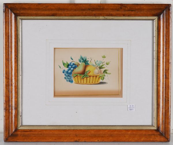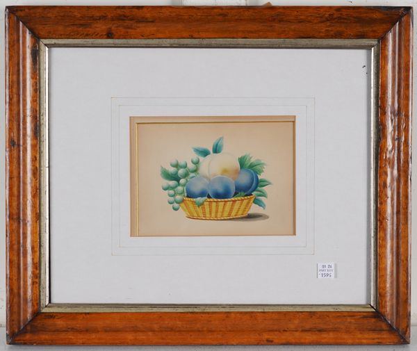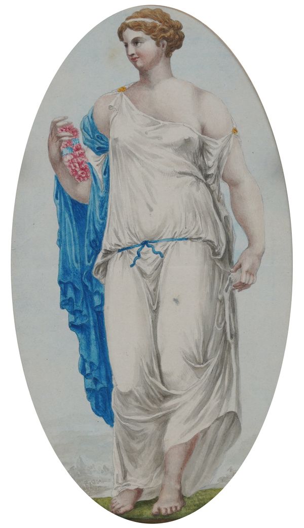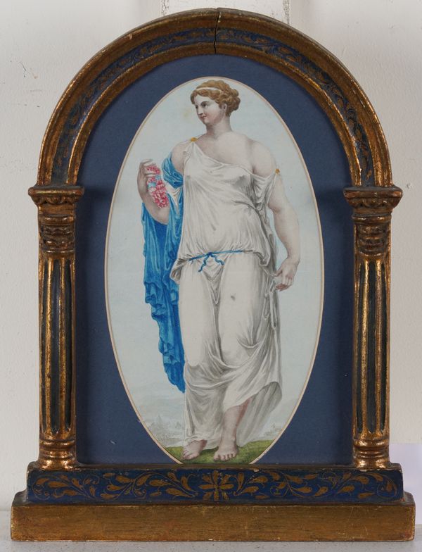 Goddess Flora watercolour 21 x 12cm, oval together with a pair of 20th century still lives of fruit in a basket, watercolour, each 12 x 17cm (3)