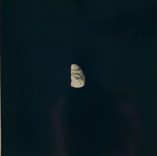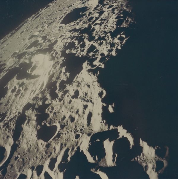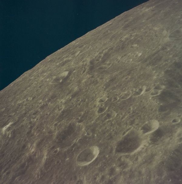 Apollo 17 - Sunset over the lunar farside seen during the first revolution of the spacecraft around the Moon; Lunar farside horizon over Craters Schlieman and Star Chaplygin; First photograph of the Earth setting over the dark side of
