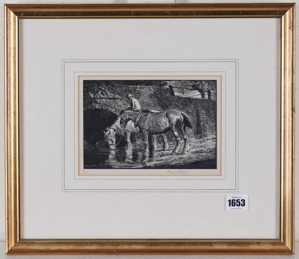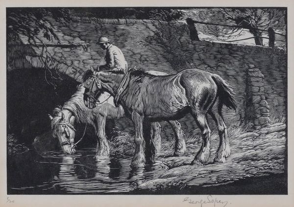 Horses watering signed and numbered in pencil 'George Soper 5/20' (in lower margin) woodcut print 12 x 18.5cm