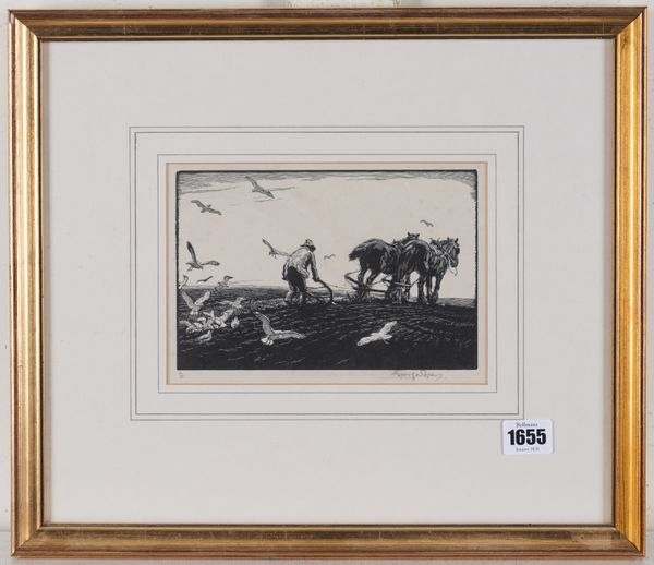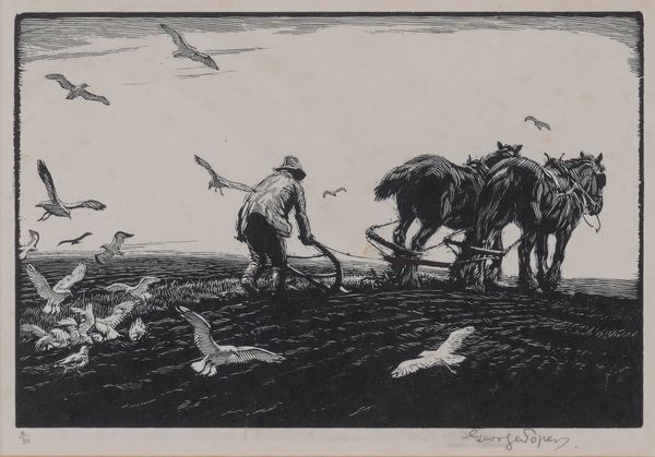 Gulls following the plough signed and num bored in pencil 'George Soper 2/50' (in lower margin) woodcut print 12.5 x 19cm