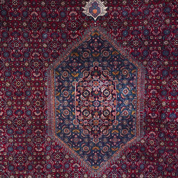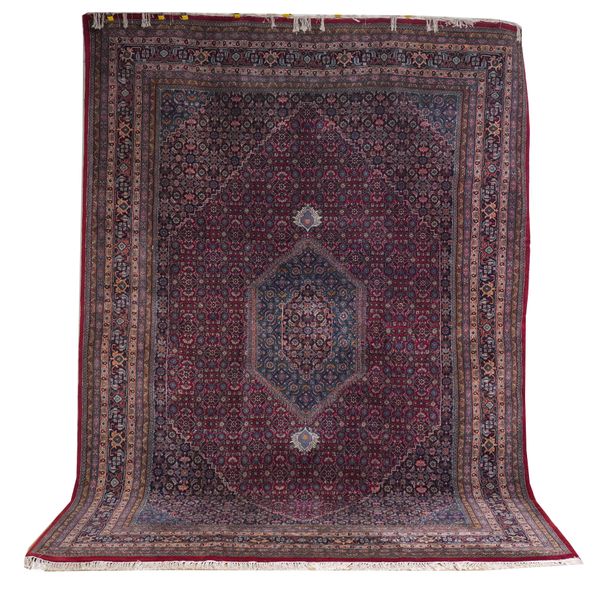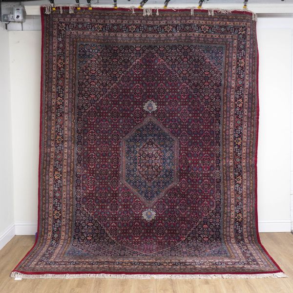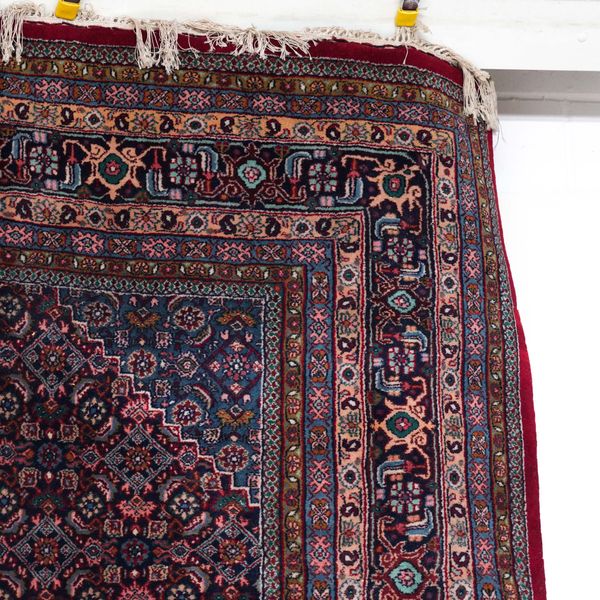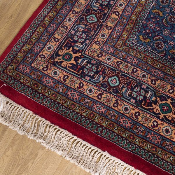 The madder field with a pale indigo lozenge medallion, dark indigo spandrels all with a herate design; an indigo palmette and trailing floral border; 345cm x 248cm, circa 1980s