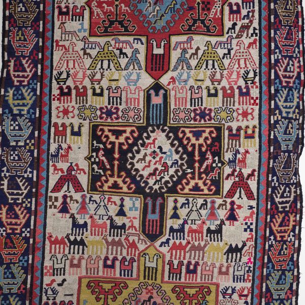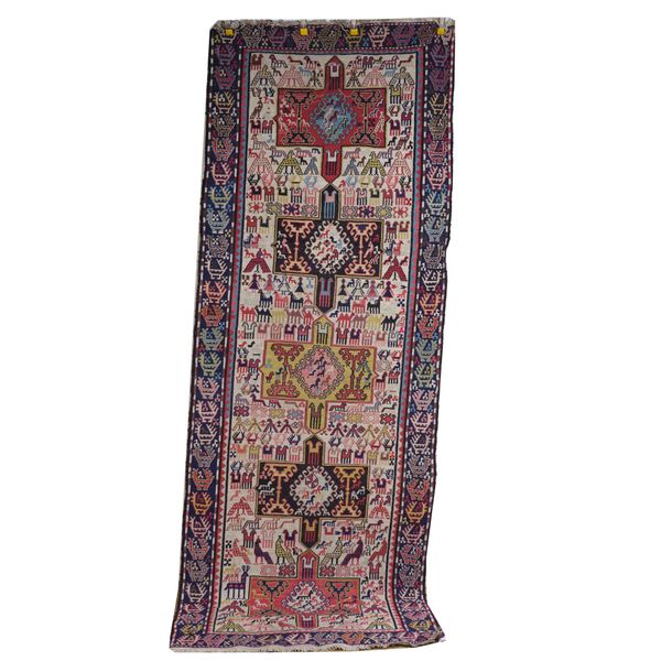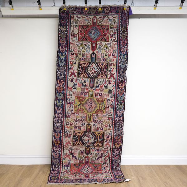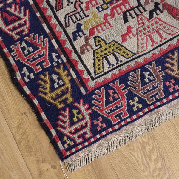 The Madder field with five bold medallions, all with stylised birds, animals, people and stylised motifs; an indigo peacock border; 297cm x 108cm, modern