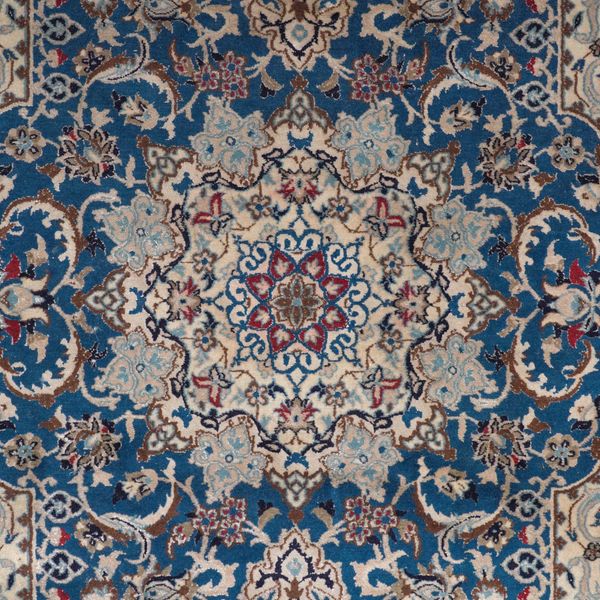 The mid-indigo field with a faceted ivory medallion, ivory spandrels all with floral sprays; an ivory palmette and lily border; 197cm x 129cm, circa 1970