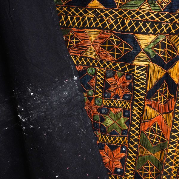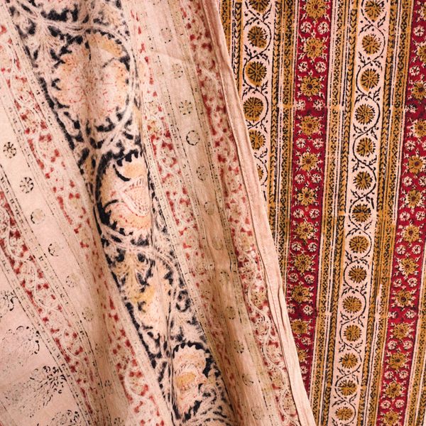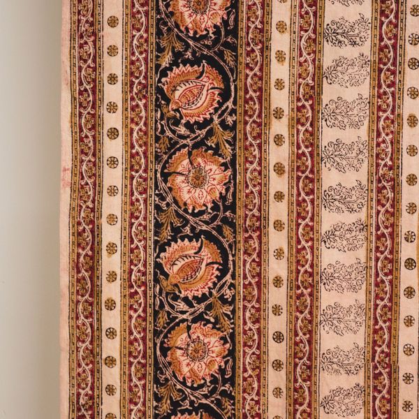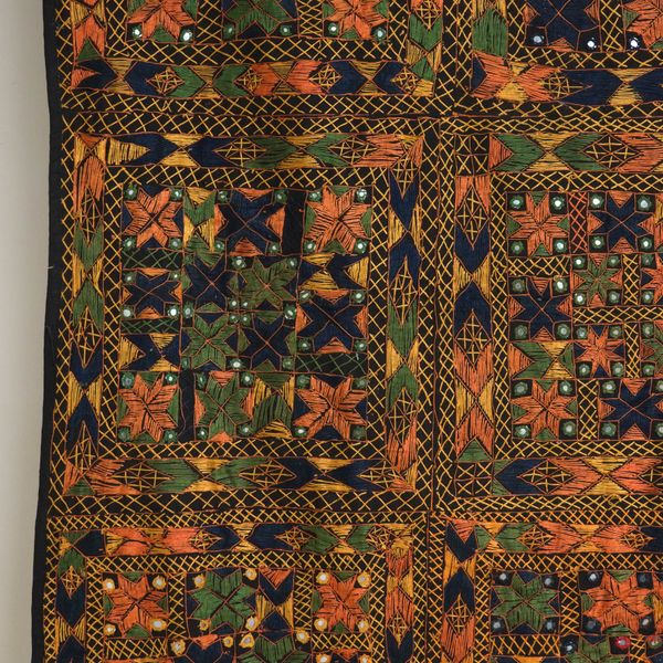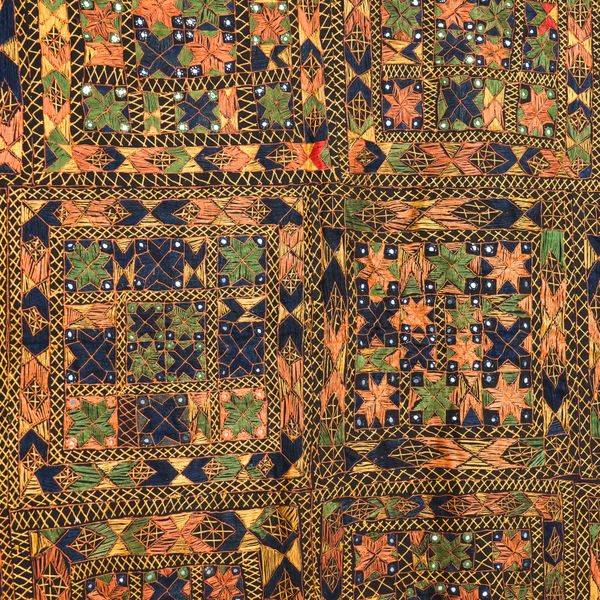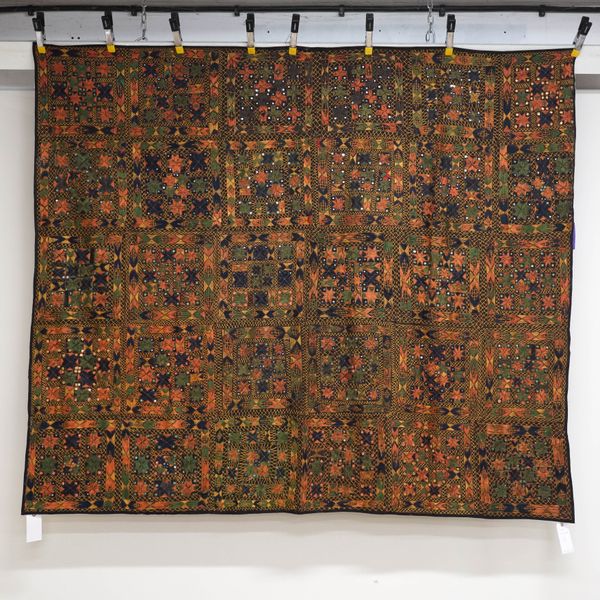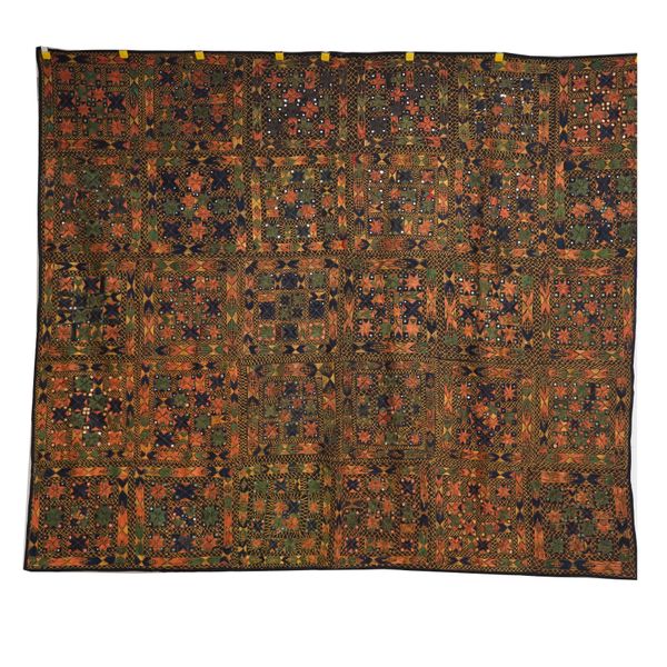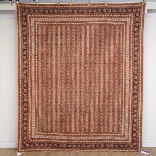 Five columns of six squares, each with star motifs, highlighted with mirror fragments in blue, orange, green and yellow; 218cm x 106cm, modern, together with an Indian block printed panel comprising madder and ivory bands of minor flowers, a black rosette border; 257cm x 223cm, modern