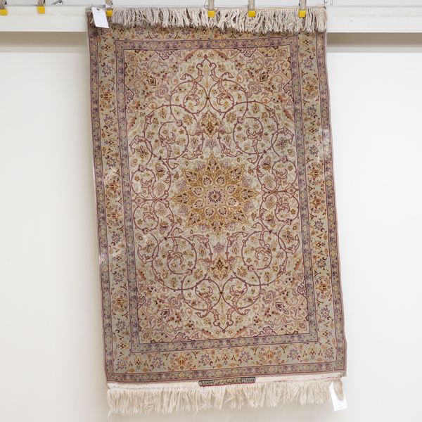 The cream field with a faceted medallion, corner spandrels all with intricate floral and curve linear sprays; a complementary border, signature panel; 166cm x 106cm, circa 1980s