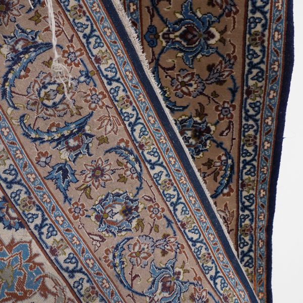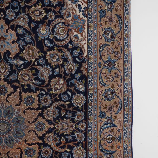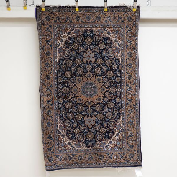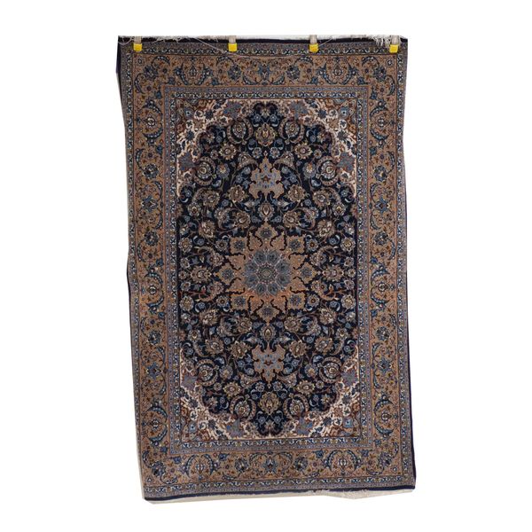 The dark indigo field with a mushroom coloured faceted medallion, ivory spandrels all with abundantly floral sprays; a complementary palmette and floral spray border; 167cm x 106cm, circa 1970s