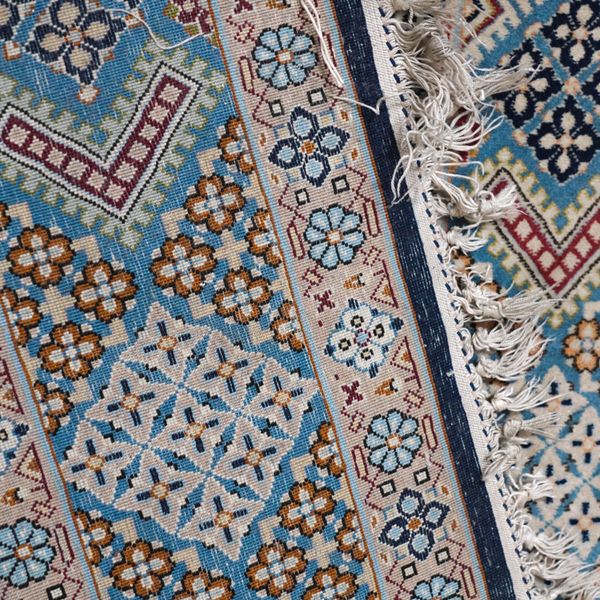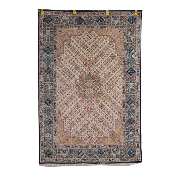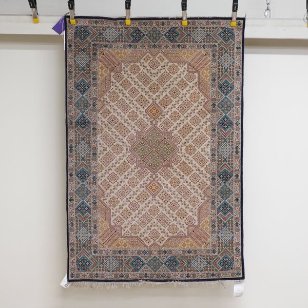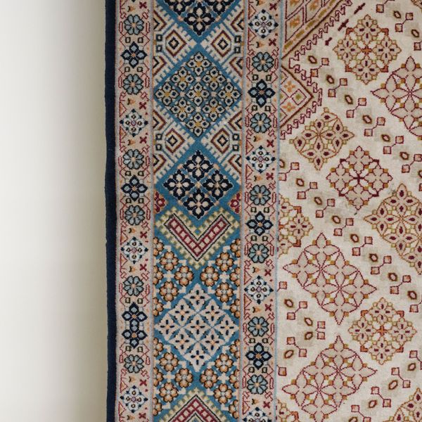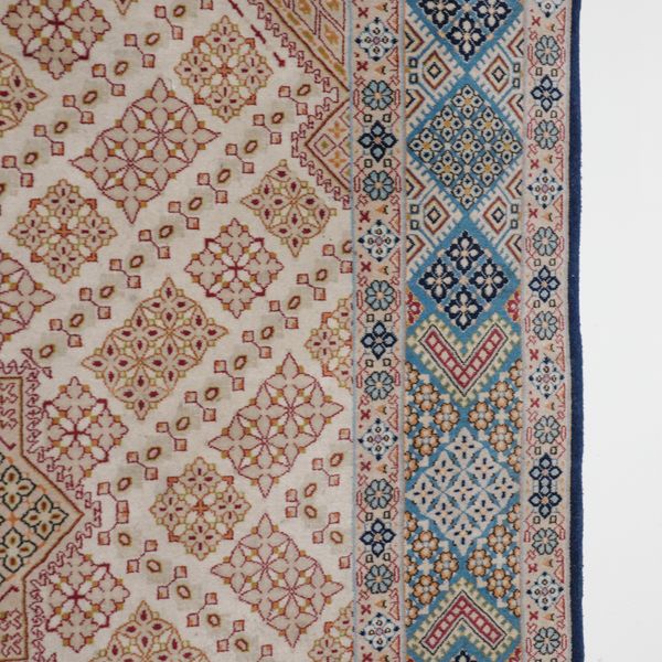 The ivory diamond flower head field with a star tiled medallion, willow tree spandrels; mid-indigo diamond flowered border; 160cm x 107cm, circa 1960