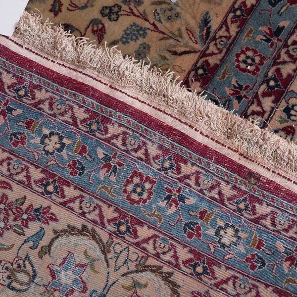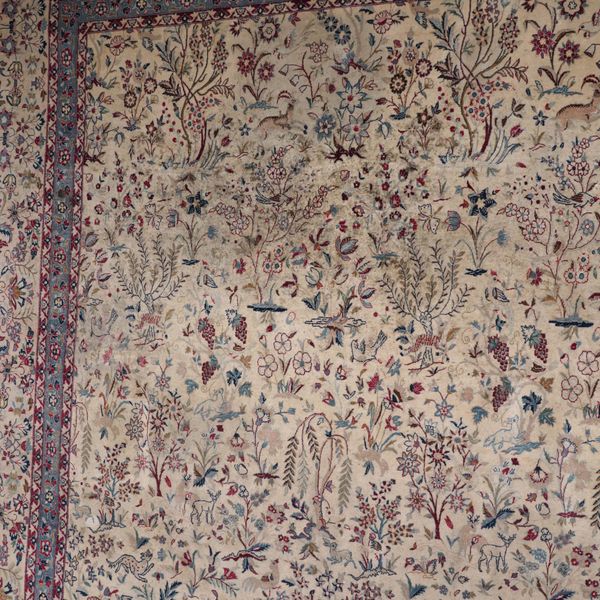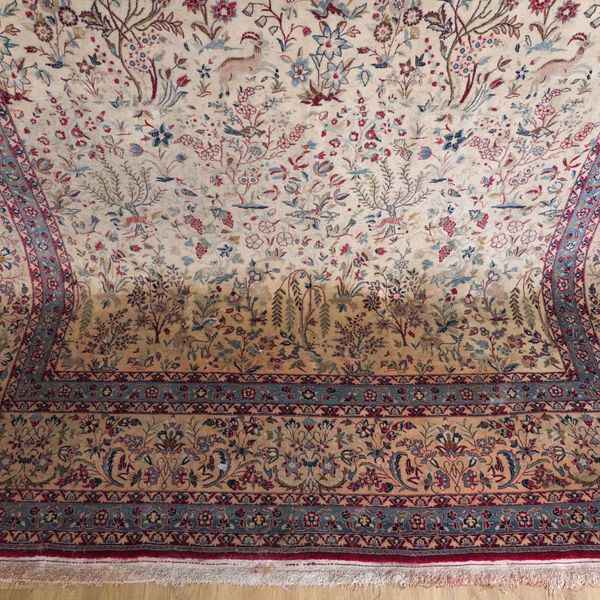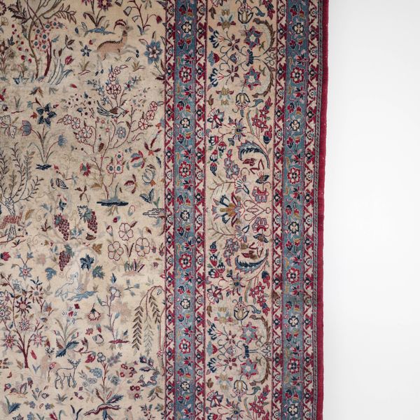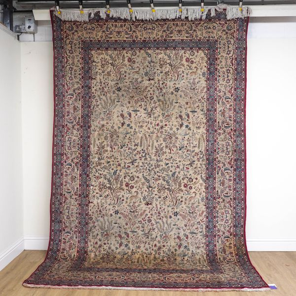 The ivory field with an all-over design of flowering trees and willows together with naturalistic animals and birds and flowering plants; a matching trailing flower border; 338cm X 218cm, circa 1950