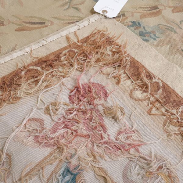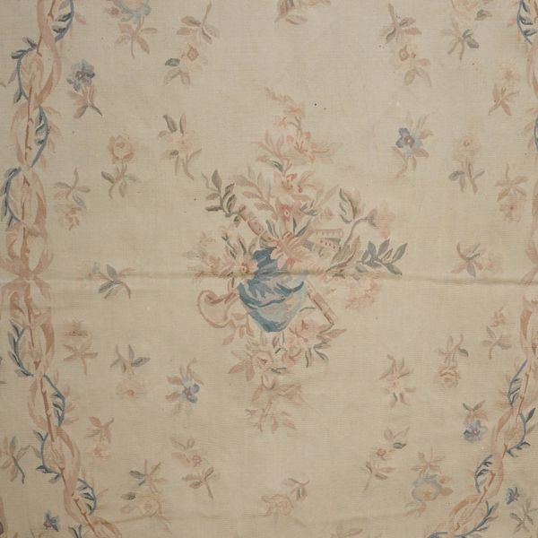 The carpet is of Aubusson design. The pale brown field with a central design of flowers and instruments, two sets of garlands and other naturalistic floral sprays; an outer surround of leaf sprays; 373cm x 265cm, circa late 20th century