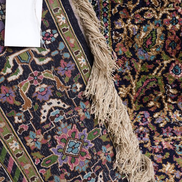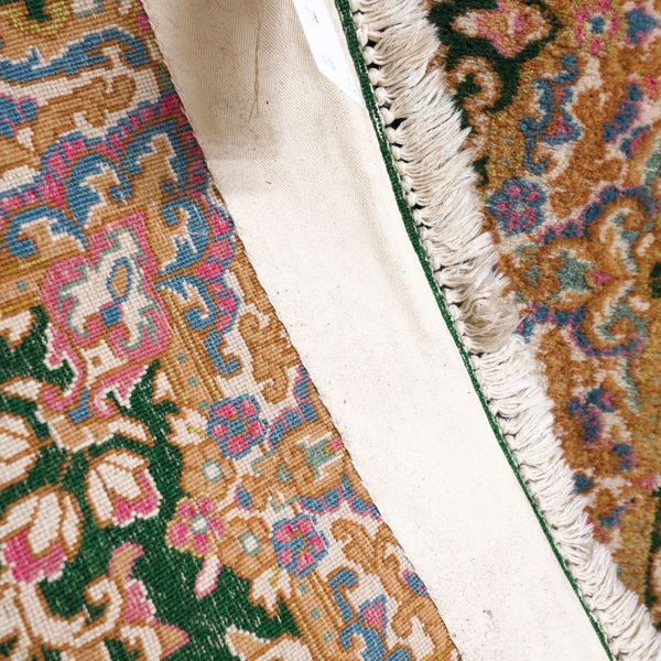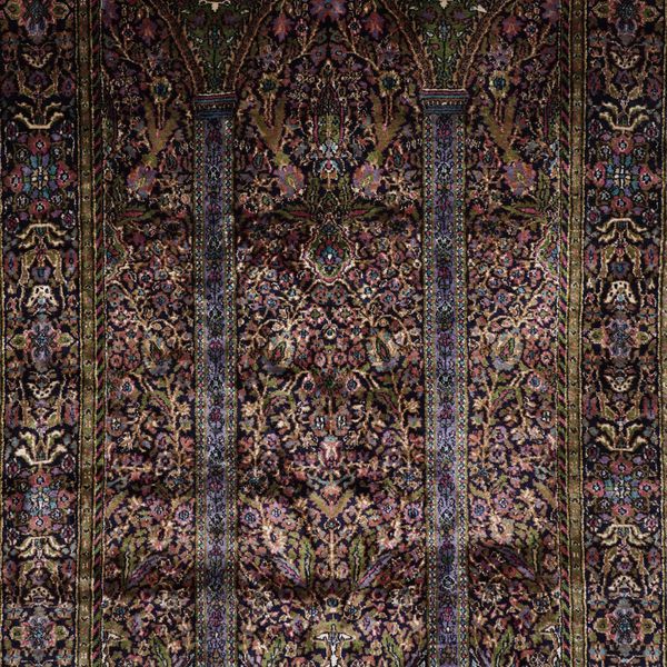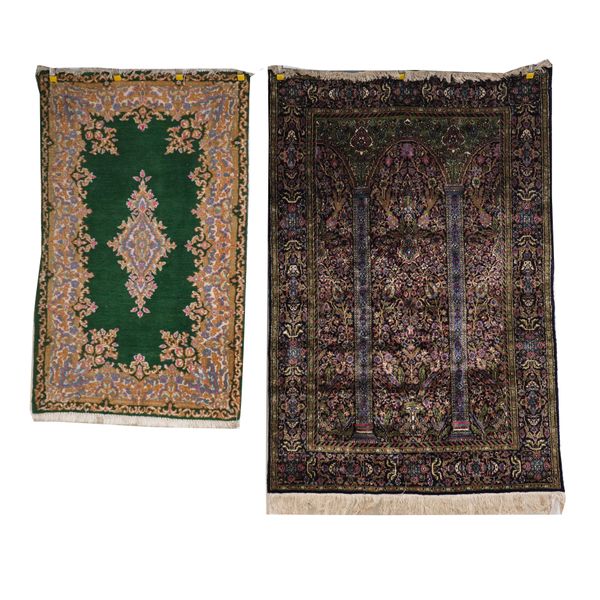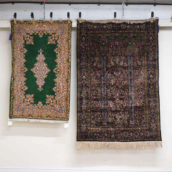 The flower filled black mehrab with two columns rising to a sage arch; black floral border; 184cm x 123cm, circa late 20th century, together with an Indian rug, the plain green field with a diamond medallion, matching outer floral surround; 148cm x 90cm, modern