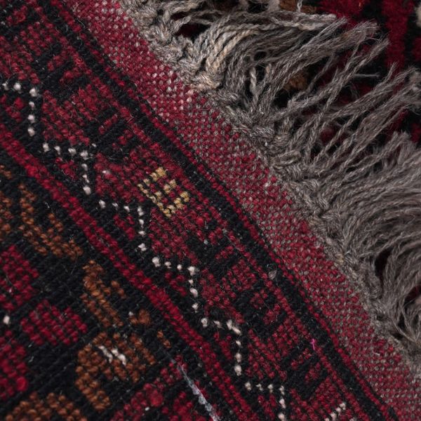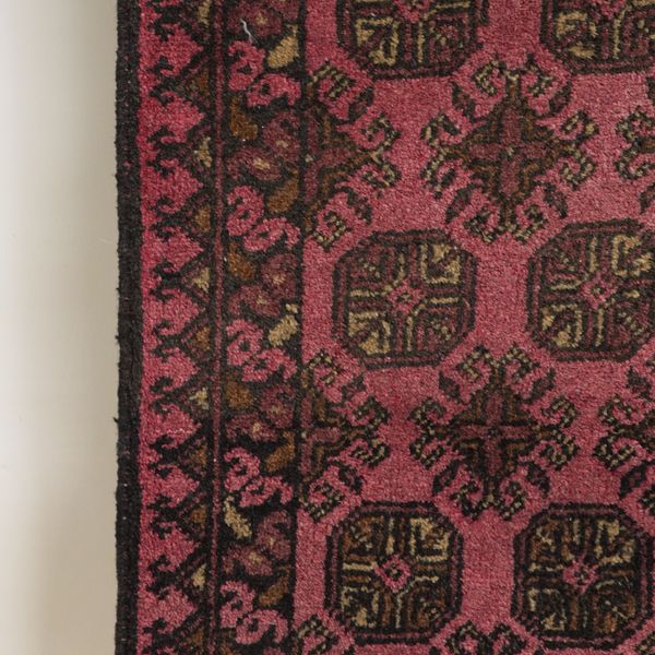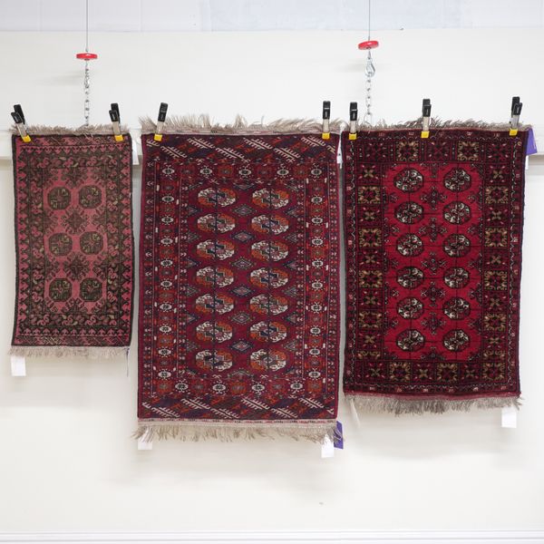 The madder field with two columns of seven guls; a sunburst border, skirt ends; 127cm x 85cm, circa 1950s, an Afghan rug with two columns of six guls; a flower head border; 116cm x 75cm, modern, and an Afghan mat with six guls; 92cm x 49cm, modern