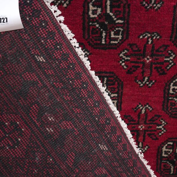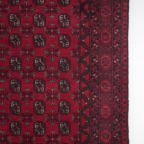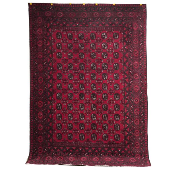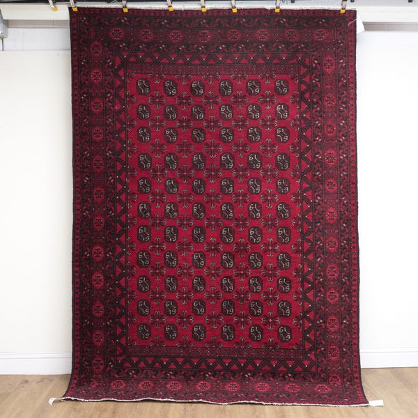 The madder field with six columns of eleven guls supporting cross motifs; various borders; 288cm x 201cm, modern