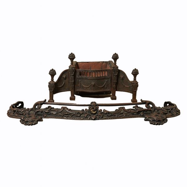 Early 20th Century Serpentine shaped basket and sides flanked by supporting torches, swag and lion mask detail, cast with PATENT no. 8806 and various initials, 77cm wide; Together with a pierced scrolling foliate fender, 123cm wide