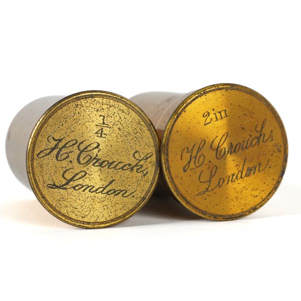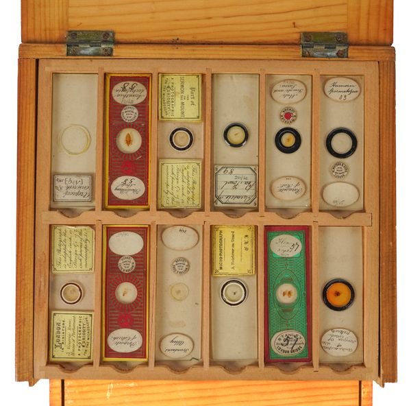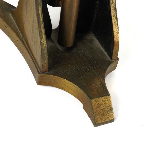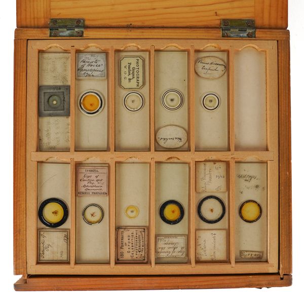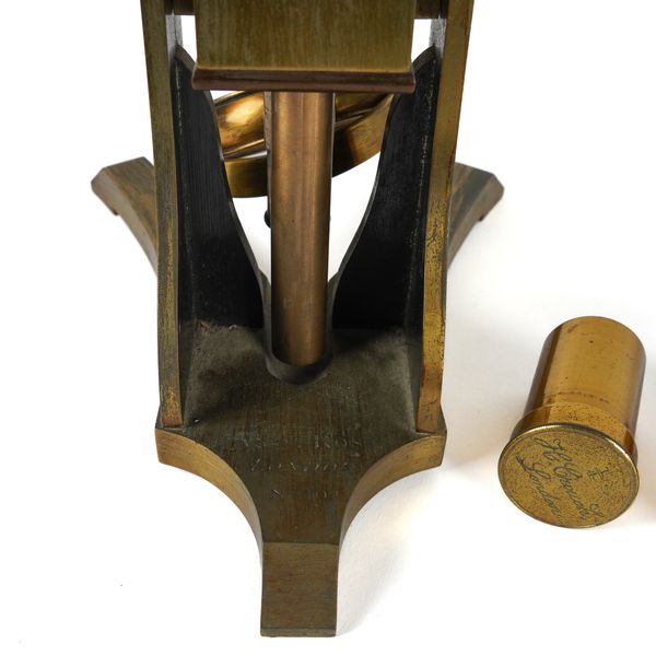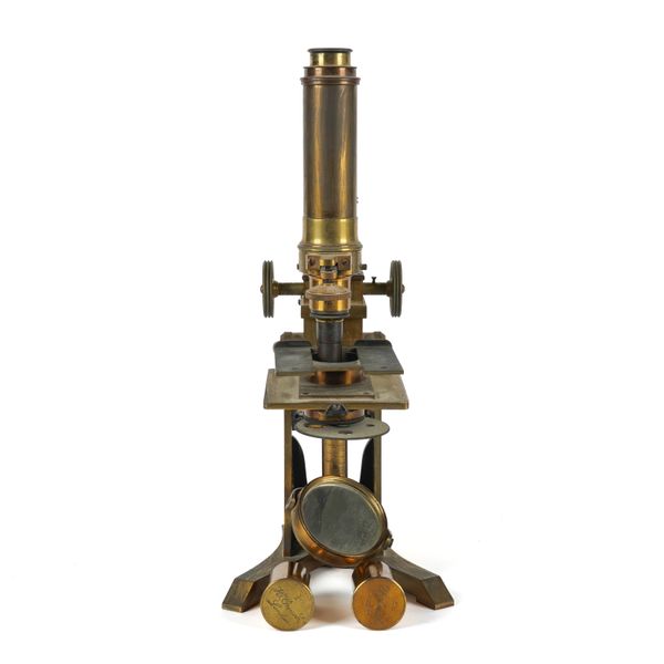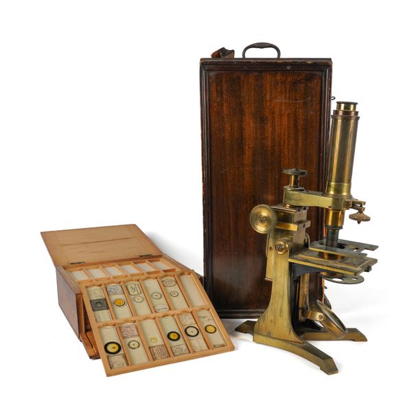 Engraved to the foot 'AND.W ROSS LONDON NO. 102', with two additional cased lenses engraved '1/4 H.Crouch London' and '2in. H Crouch London', 36cm high, in a mahogany veneered box with brass carrying handle; Together with various specimen slides in a pine box, 21cm x 20cm x 8.5cm