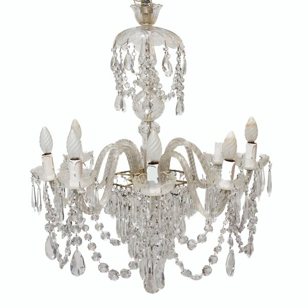 A REGENCY STYLE GLASS AND SILVERED METAL EIGHT LIGHT GLASS CHANDELIER