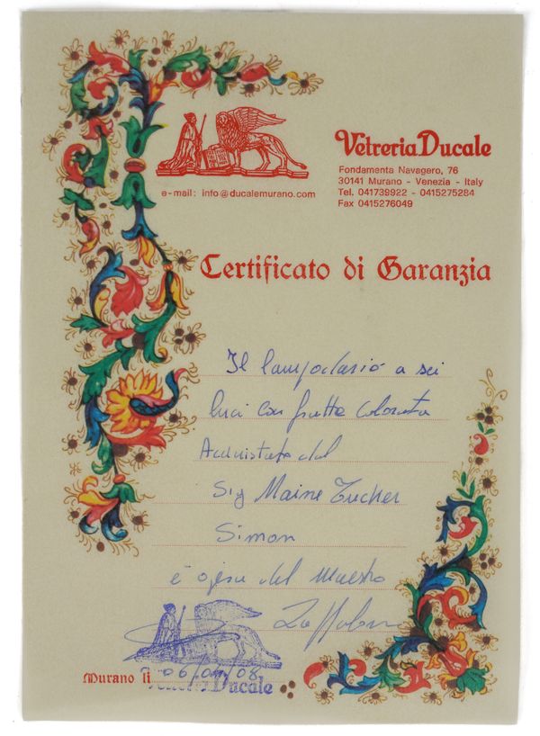 Sold with certificate from Vetreria Ducale, Murano, Italy, dated 2008.