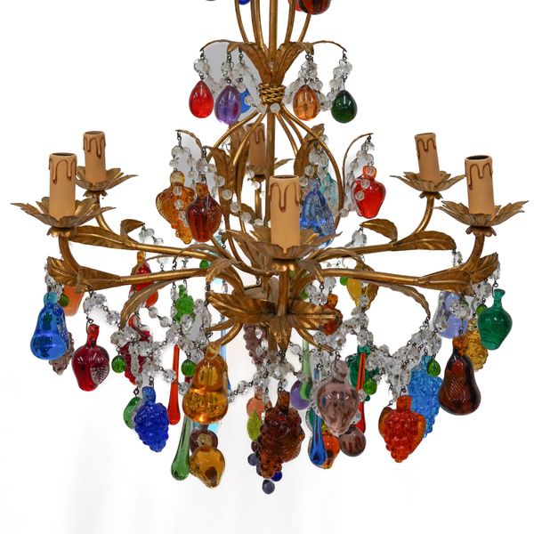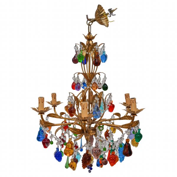 AN ITALIAN GILT-TOLE AND GLASS MOUNTED ‘TUTTI FRUITI’ SIX LIGHT CHANDELIER