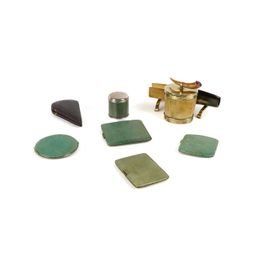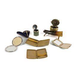 Together with other shagreen items including a cylindrical match box, hallmarked London, 1899, 4.5cm high; two cigarette cases, 8.5cm wide and 9cm wide; two compact cases, 7cm wide and 8cm wide; a cork screw in a case; and a gilt-metal horn mounted inkwell and pen rest with pink glass paste to the hinged cover, 16cm wide