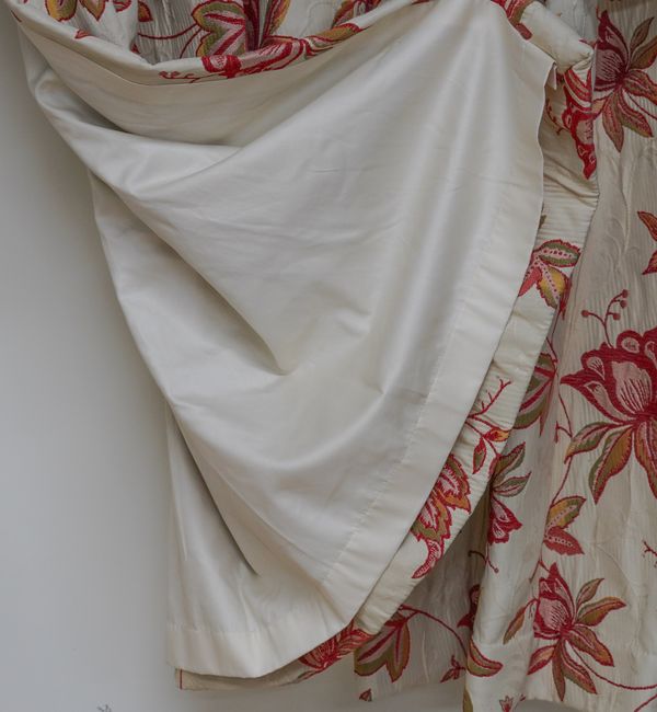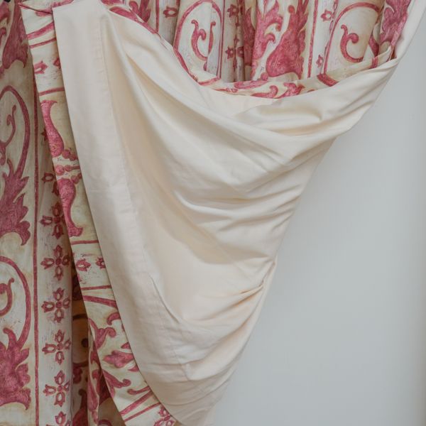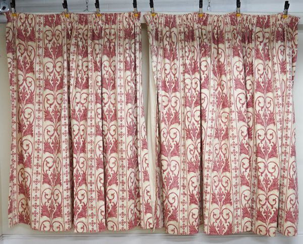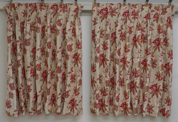 Comprising three pairs of cream cotton with floral red and yellow patterns, triple pleat and lined, the first, 120cm x 106cm; the second pair 120cm x 160cm; the third pair 165 x 220cm; Together with two pairs of pink patterned pencil pleat curtains, lined, with four twisted cotton tie-backs, the first pair, 260cm x 215cm; the second pair 400cm x 215cm