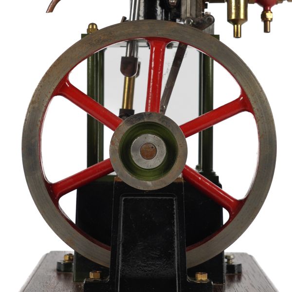 The model of a Stuart Turner 'James Coombe' table engine, with a single cylinder, a 7 inch diameter spoked flywheel. finished in green and red paintwork with polished bright-work, mounted on a wooden base, the model 36cm high, 42cm high including base