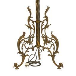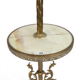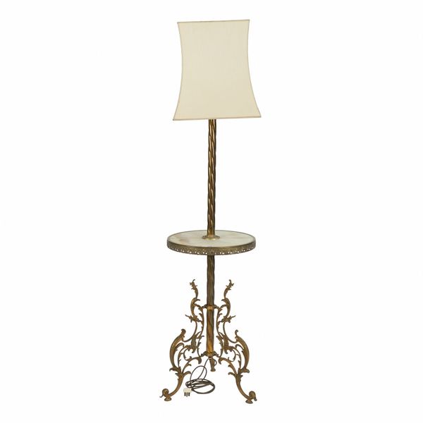 Mid-20th Century On three scroll supports, with central onyx circular shelf around a writhen column, 174cm high excluding shade