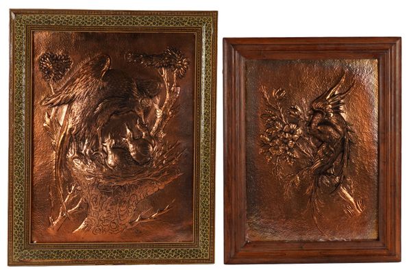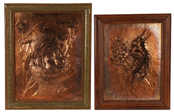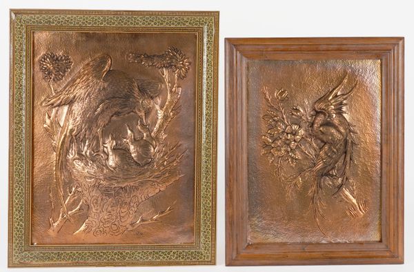 The larger depicting a bird feeding its chicks in a nest, signed in Arabic script to the lower right, in frame 43cm x 53cm; Together with a smaller panel depicting two birds entwined on a branch, signed to the lower right in Arabic script, in frame 37cm x 48cm