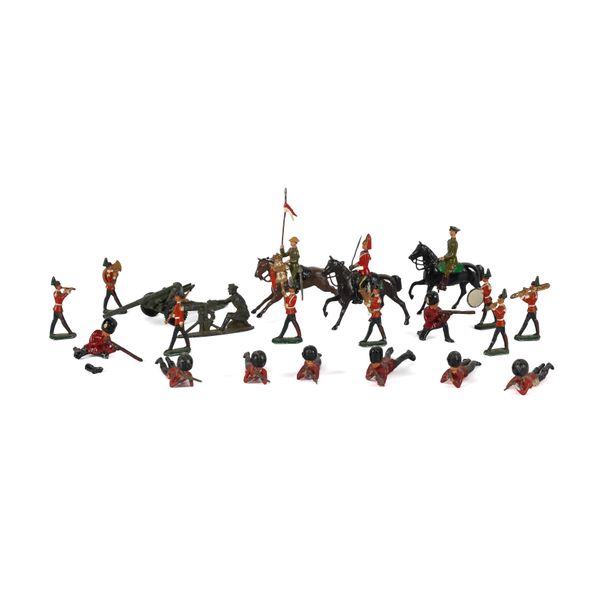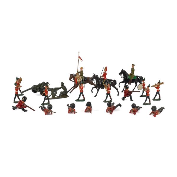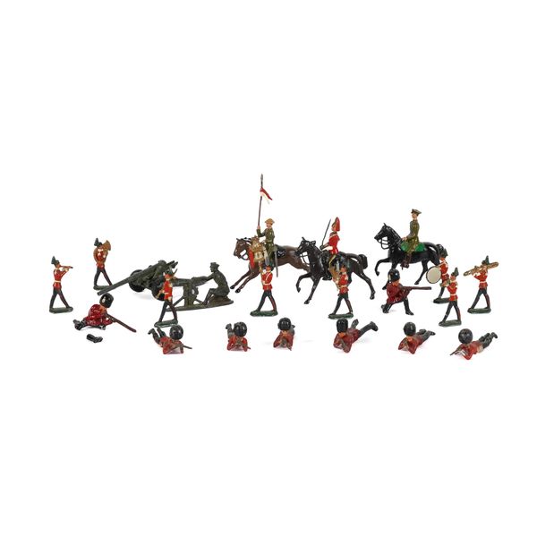 The collection including a set of military band figures on integrated bases, the tallest 7.5cm high, a group of horse mounted figures including by Britain's, various small figures with bayonets and guns and two green painted items one by Dinky