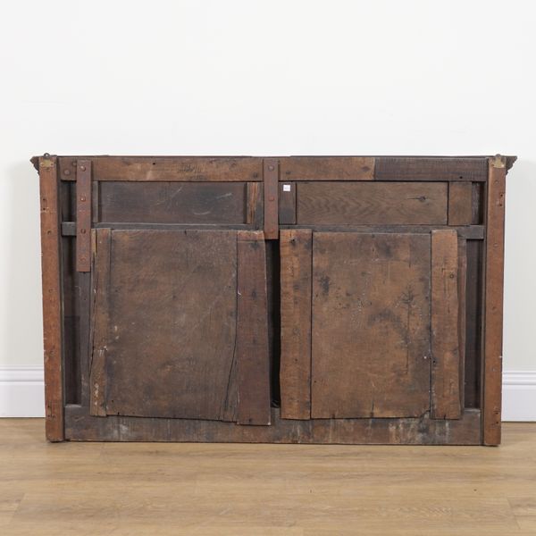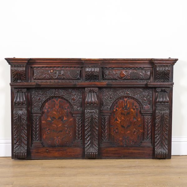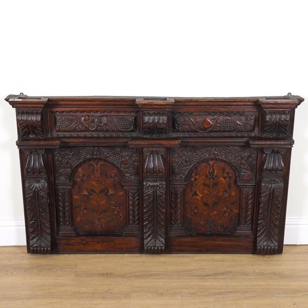 A 17TH CENTURY MARQUETRY INLAID OAK OVERMANTEL