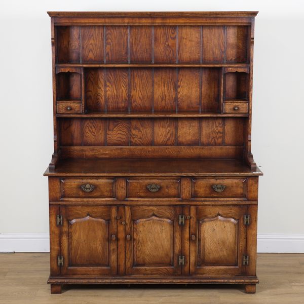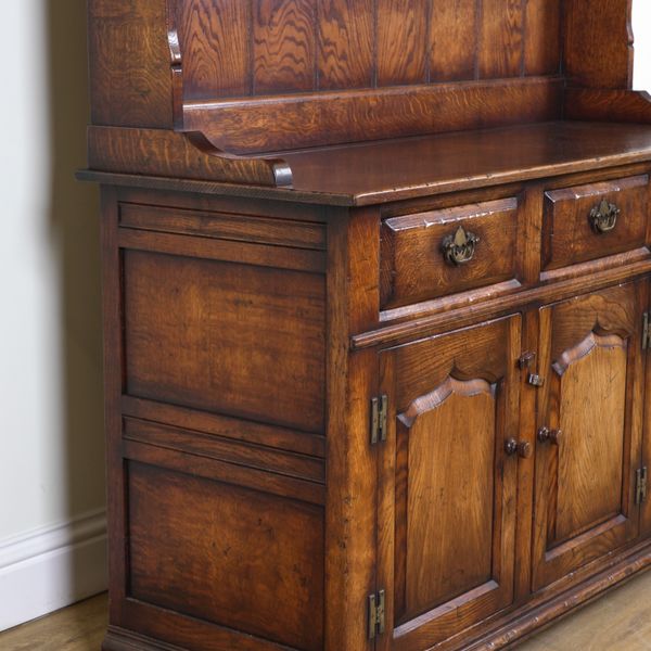 20th century, with two tier enclosed plate rack over three drawers and cupboards, 142cm wide; 51cm deep; 190cm high