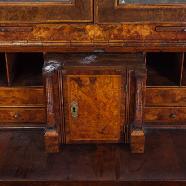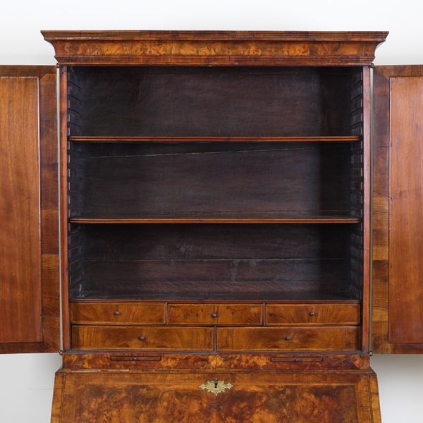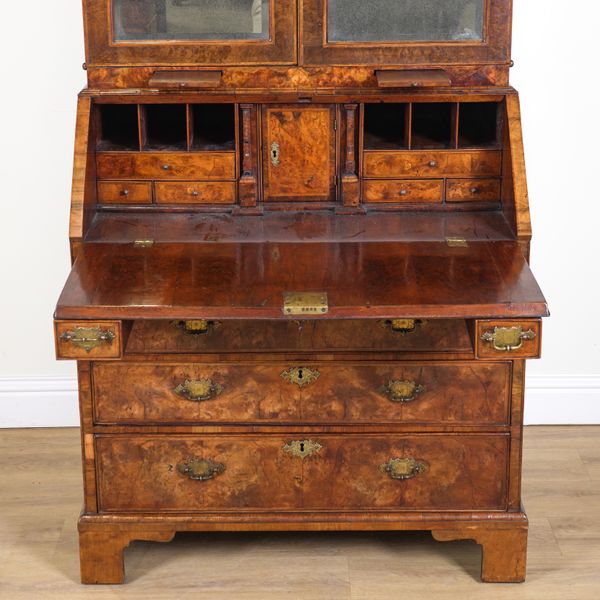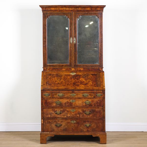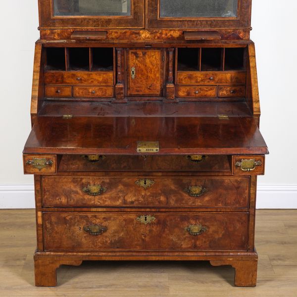 A GEORGE II BURR WALNUT BUREAU BOOKCASE