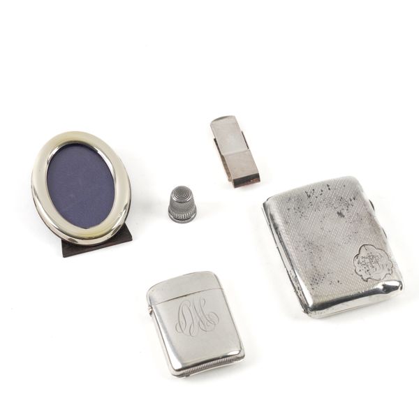 Comprising; a cigarette case, Birmingham 1916, a Sterling vesta case, monogram engraved, a silver thimble, a money clip, formed as an abacus, detailed Sterling Silver 925, combined gross weight 156 grams and a small oval photo frame, import mark London 1978