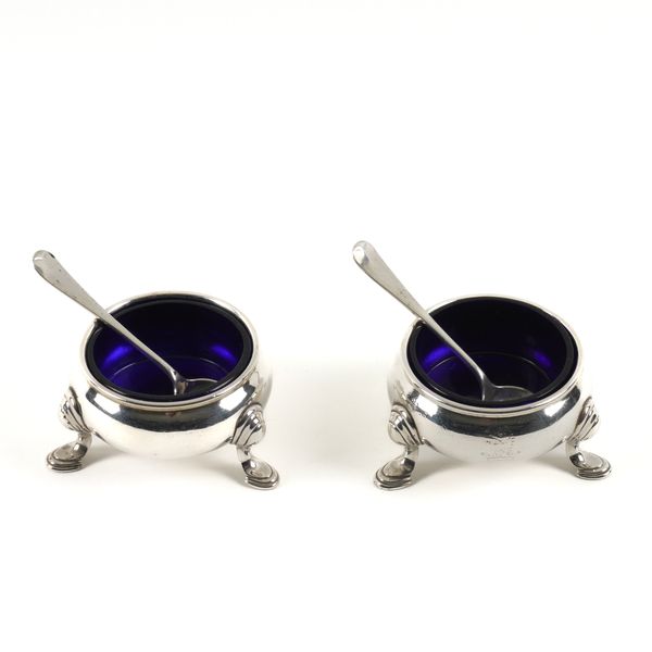 A PAIR OF GEORGE II SILVER CAULDRON SHAPED SALTS AND A PAIR OF SILVER SALT SPOONS (6)