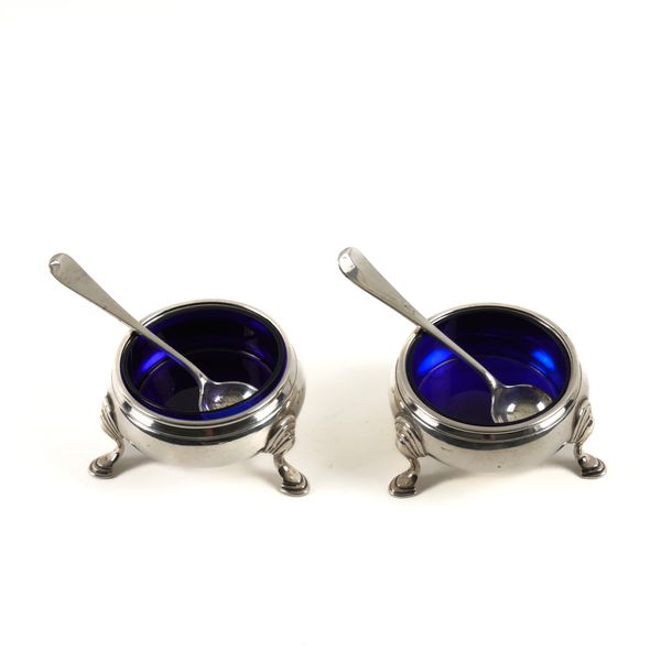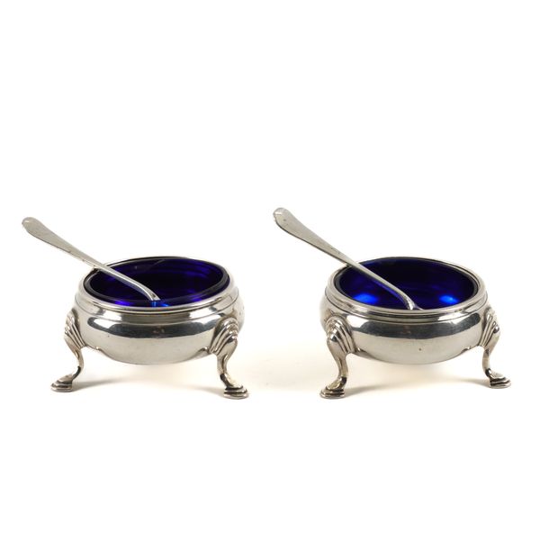 Each salt raised on three feet, each engraved with the initial C, London 1736 and London possibly 1775, a pair of rat tail pattern salt spoons, crest engraved, London 1904, combined weight 162 grams, with two blue glass liners