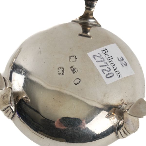 A NEAR PAIR OF SILVER CAULDRON SHAPED SALTS AND A PAIR OF SILVER SALT SPOONS (6)