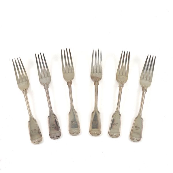 A SET OF SIX VICTORIAN SILVER DOUBLE STRUCK, FIDDLE AND THREAD PATTERN TABLE FORKS (6)