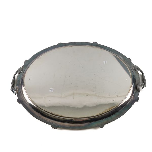 A LARGE PLATED SHAPED OVAL TWIN HANDLED TRAY
