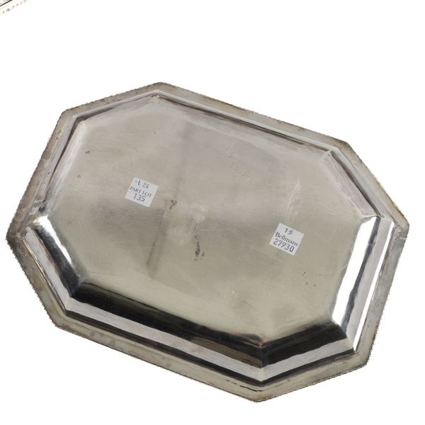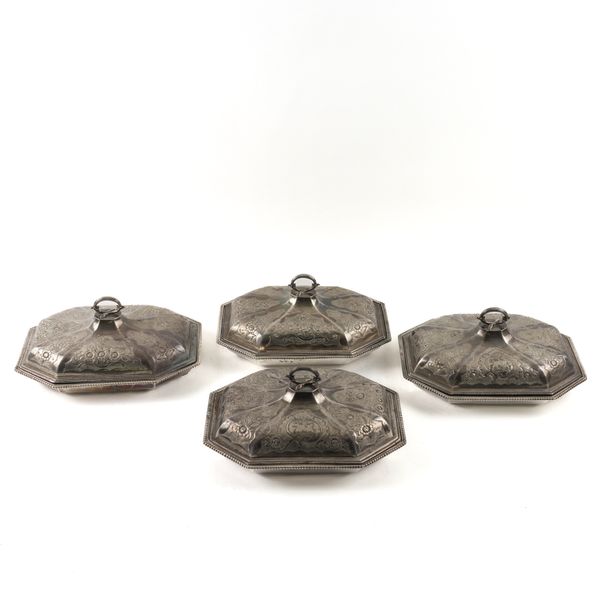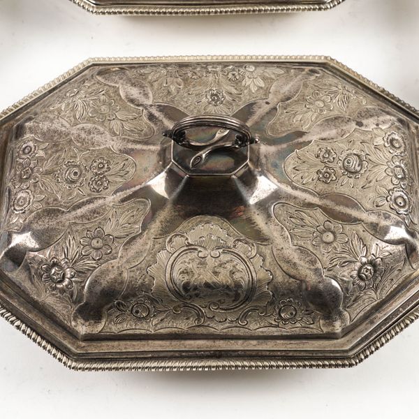 Each base of octagonal form, with gadrooned decoration to the rims, London 1788, the detachable covers with later floral and foliate embossed decoration, armorial engraved and with reeded loop form attached handles, (marks to bases partly obscured by the later embossing), but in common throughout with maker's mark Daniel Smith & Robert Sharp, combined weight 4615 grams
