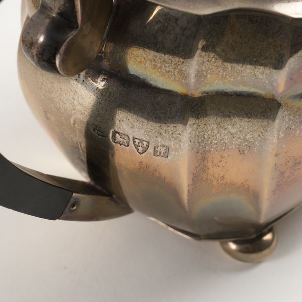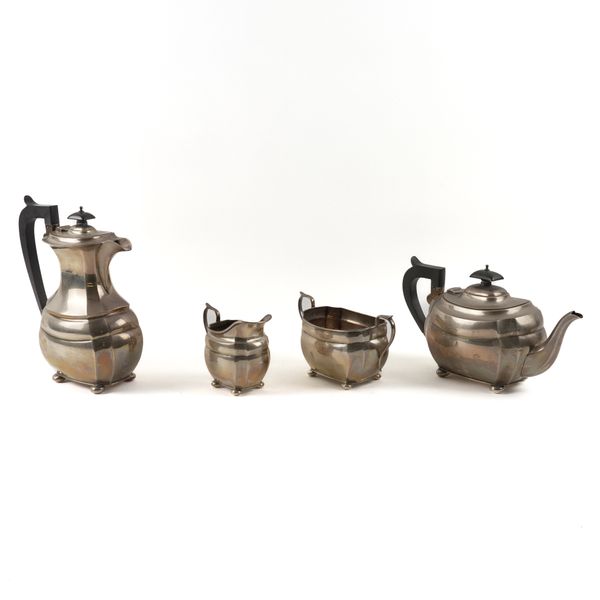 Comprising,; a teapot, Chester 1931, a hot water jug, Birmingham 1931 (both having black fittings), a twin handled sugar bowl, Chester 1929 and a milk jug, Chester, (the date letter rubbed), each piece raised on four bun feet, combined gross weight 1370 grams