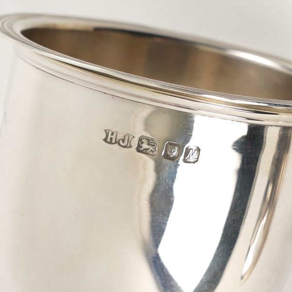 The wine funnel fitted with a lip to the detachable top, London 1986, length 24cm, weight 185 grams, with a case detailed The Hugh Johnson Collection, the circular silver dish mounted with a cupro nickel Churchill crown 1965, London 1974, with a case