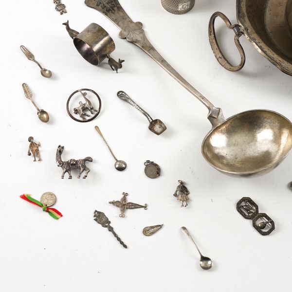 The napkin ring Sheffield 1939, weight 29 grams, the Bolivian wares comprising; a four piece tea set, a shaped oval tray, a larger twin handled tray, a large ladle, a napkin ring, a spoon with a box, five small spoons, five brooches, a small medallion, a coin, three small items and four spoons (one finial detached, but present)