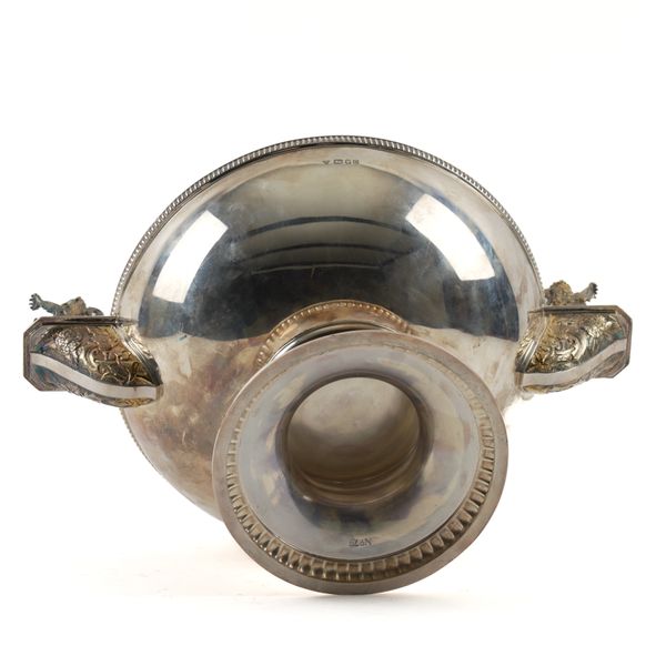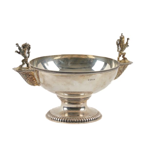 The twin handled circular bowl with gilt Royal Beast finials and National motifs representing England, Scotland and Ireland, with decorated rims and inscribed 'A Birthday Tribute to Her Majesty Queen Elizabeth The Queen Mother 4th August 1990', numbered No 79, London 1990, maker Garrard & Co Ltd, bowl diameter excluding handles 26cm, width including handles 35.8cm, weight 1980 grams