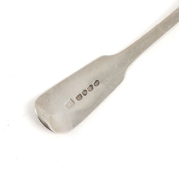 Comprising; a fiddle pattern tablespoon, London 1823, a Scottish tablespoon, Edinburgh 1867, a caddy spoon, a pair of sugar tongs, a dessert spoon, three teaspoons and a mustard spoon, combined weight 255 grams