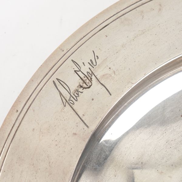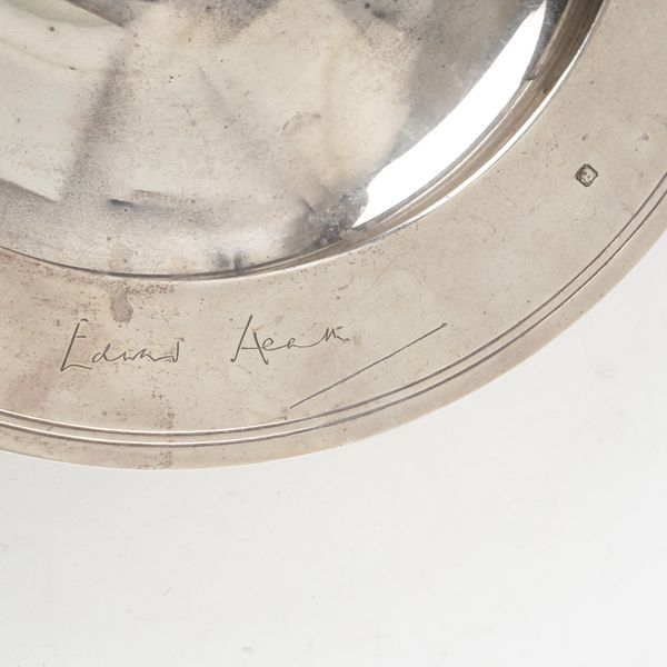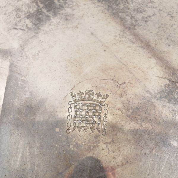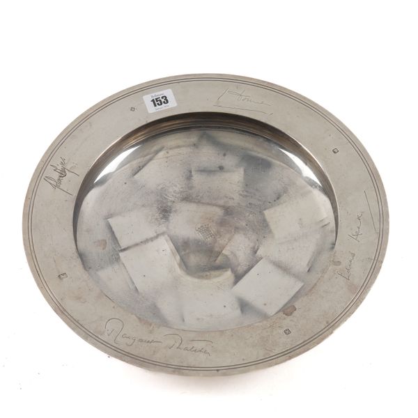 The wide rim engraved with facsimile signatures of political leaders including Margaret Thatcher, Edward Heath and John Major, the centre engraved with the portcullis motif representing The House of Commons, London 1997, maker Asprey PLC, diameter 34.4cm, weight 1415 grams